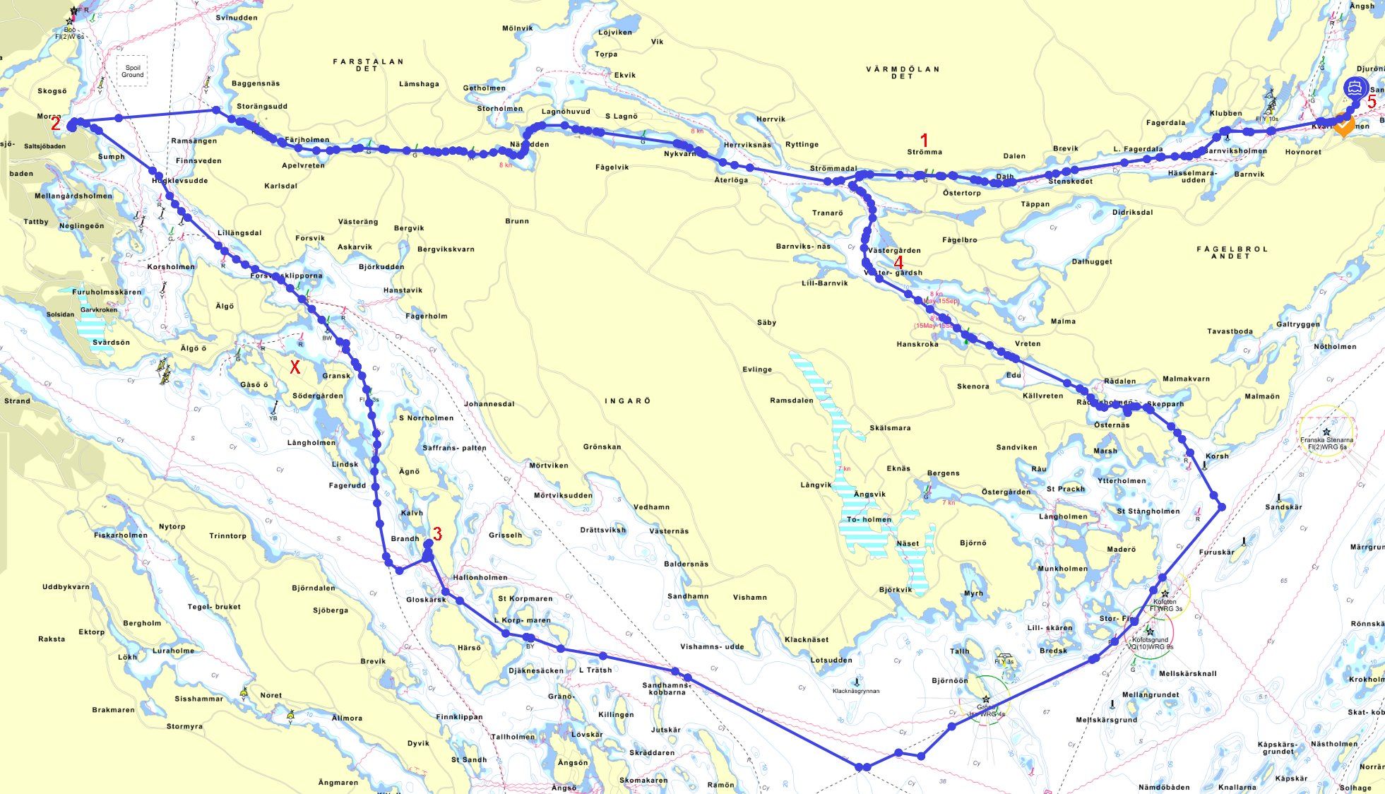 From there, the trip goes back out onto Baggensfjärden, through Fällström and past Gåsö. The island is marked with a red X. The next Card Stop is in Napoleonviken on Ägnö (3). Out on Ingaröfjärden and north on Nämdöfjärden. It can get bumpy there!